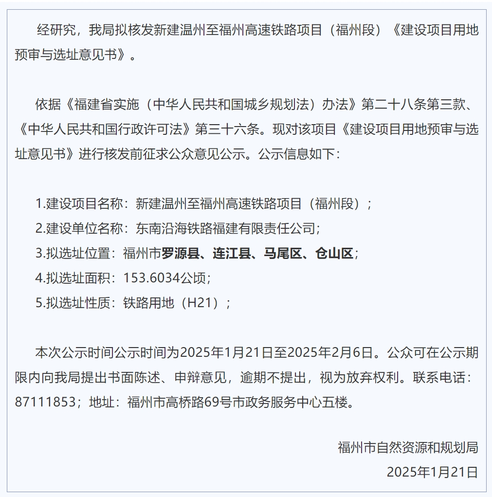 1月21日,福州市自然資源和規(guī)劃局發(fā)布《新建溫州至福州高速鐵路項(xiàng)目(福州段)批前公示》。公示內(nèi)容如下↓