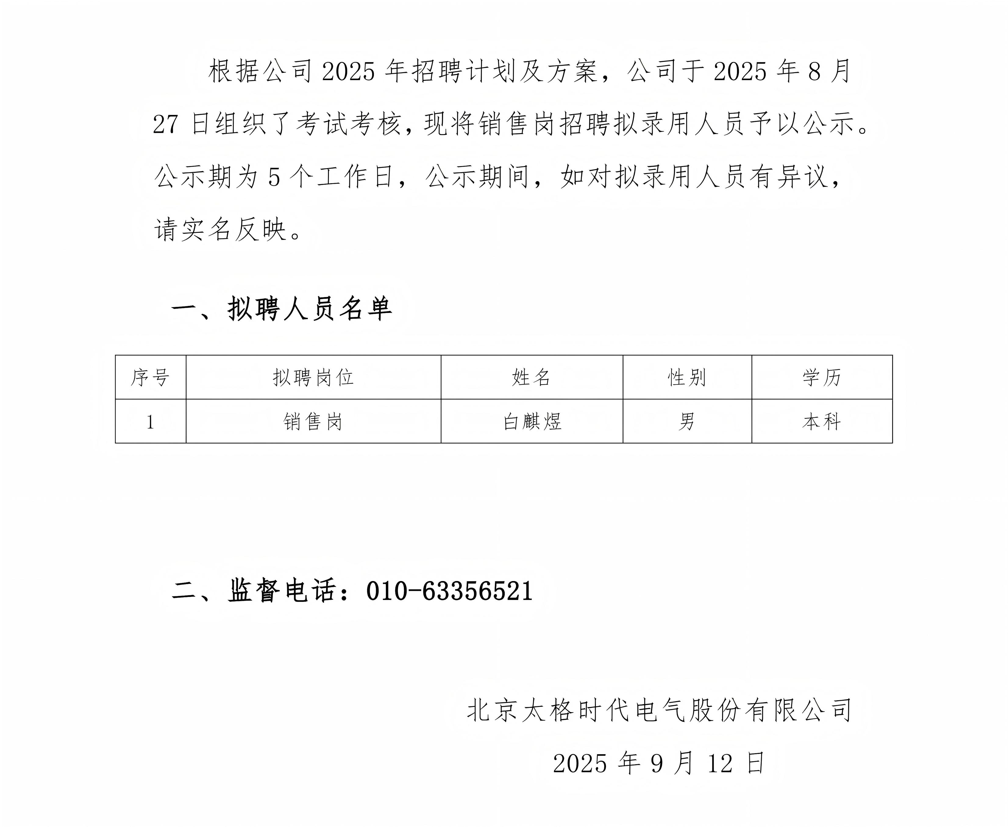 北京太格時(shí)代電氣股份有限公司 2025年銷售崗招聘擬錄用情況公示
